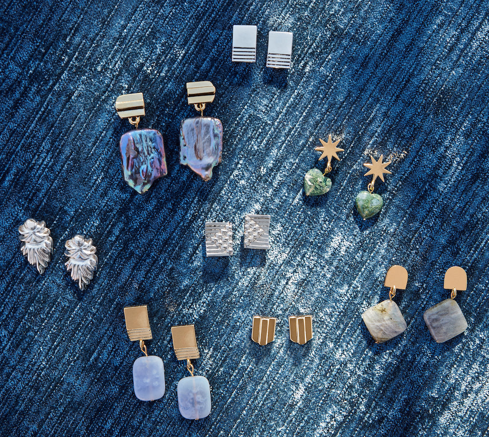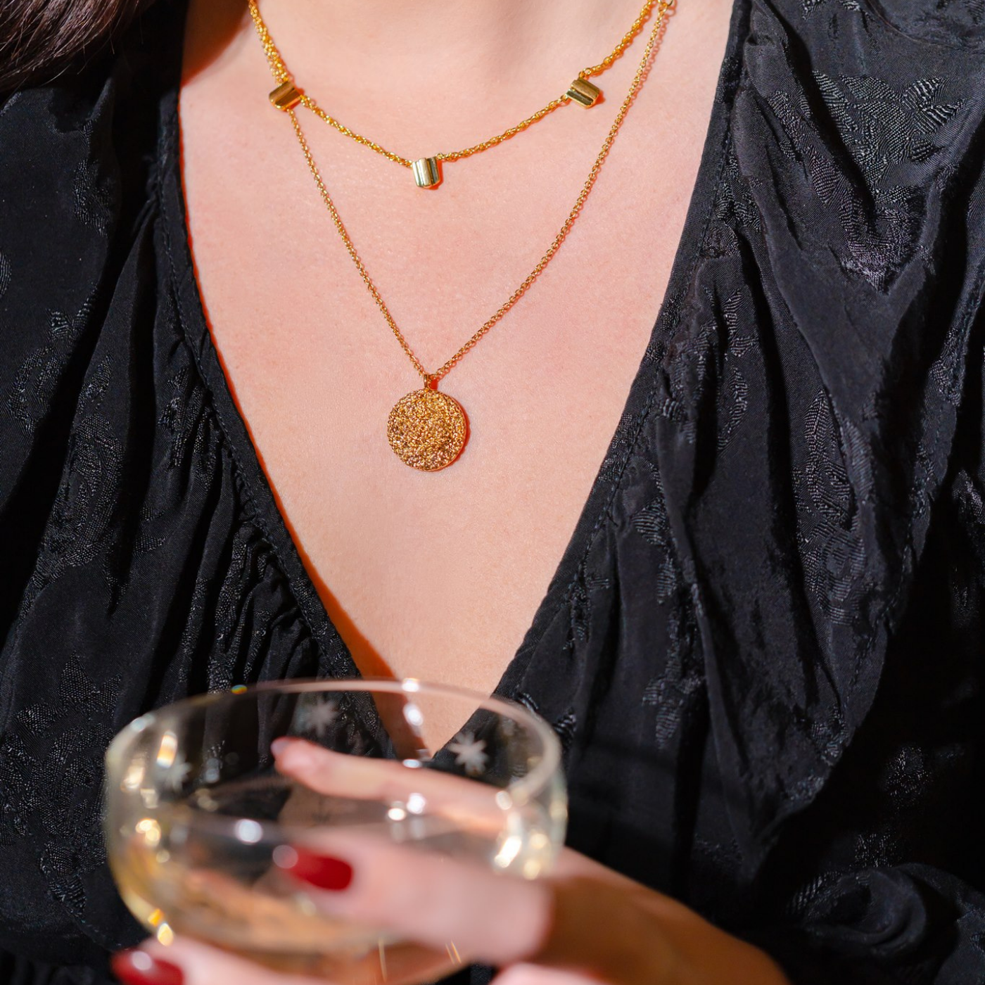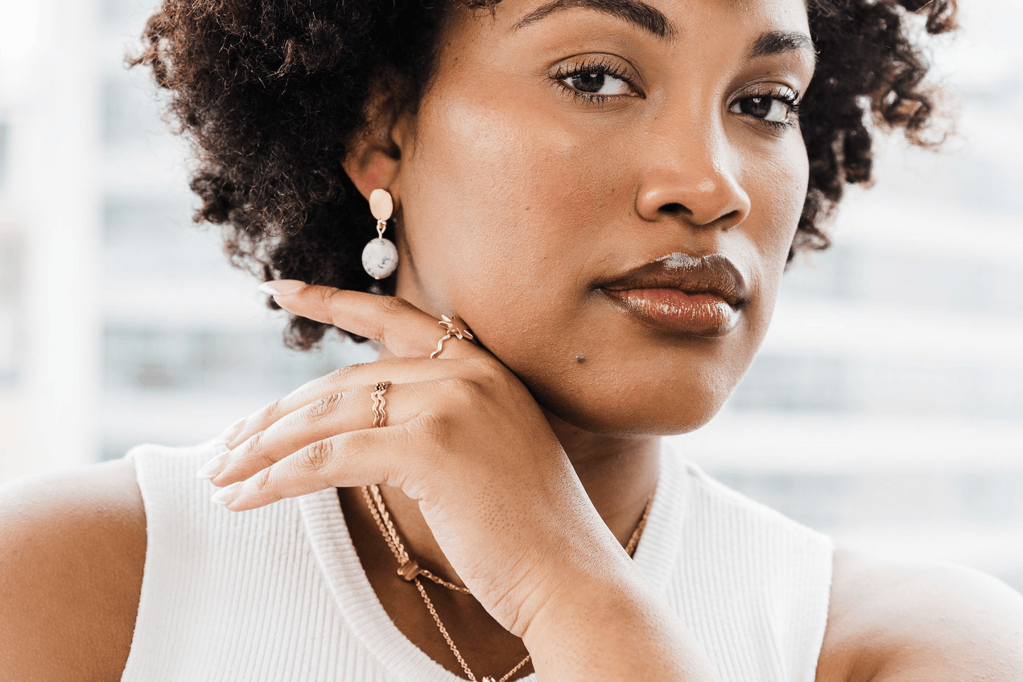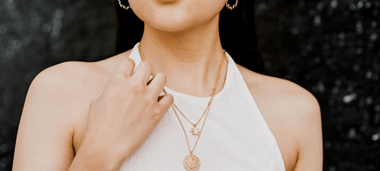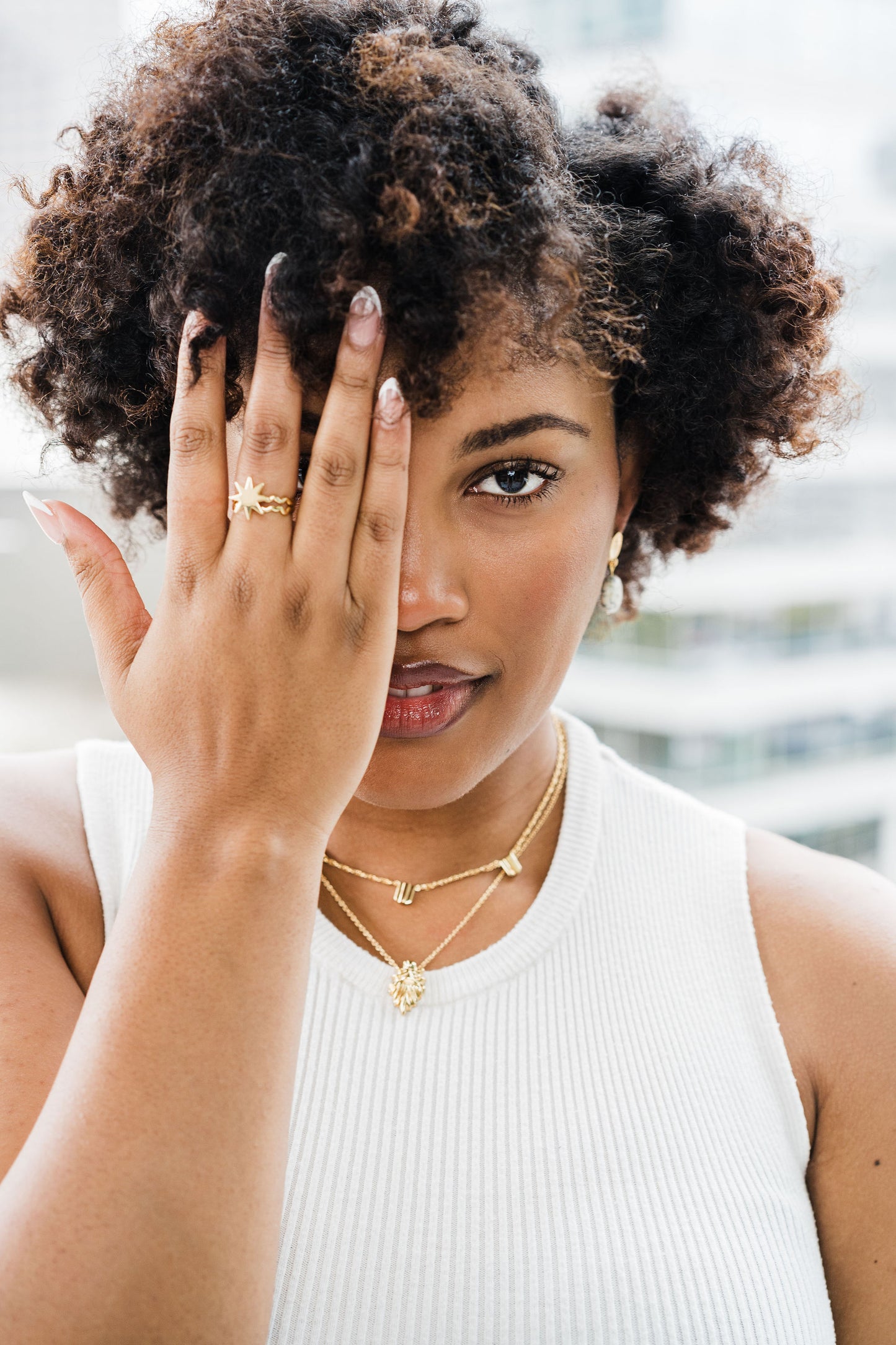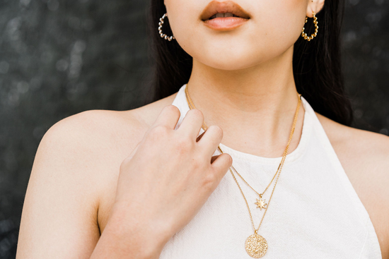 Woman wearing gold jewelry and close-up of gold jewelry on a teal surface.
