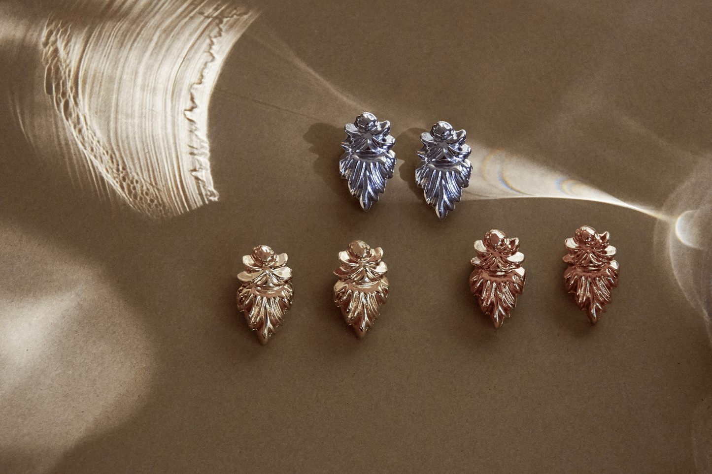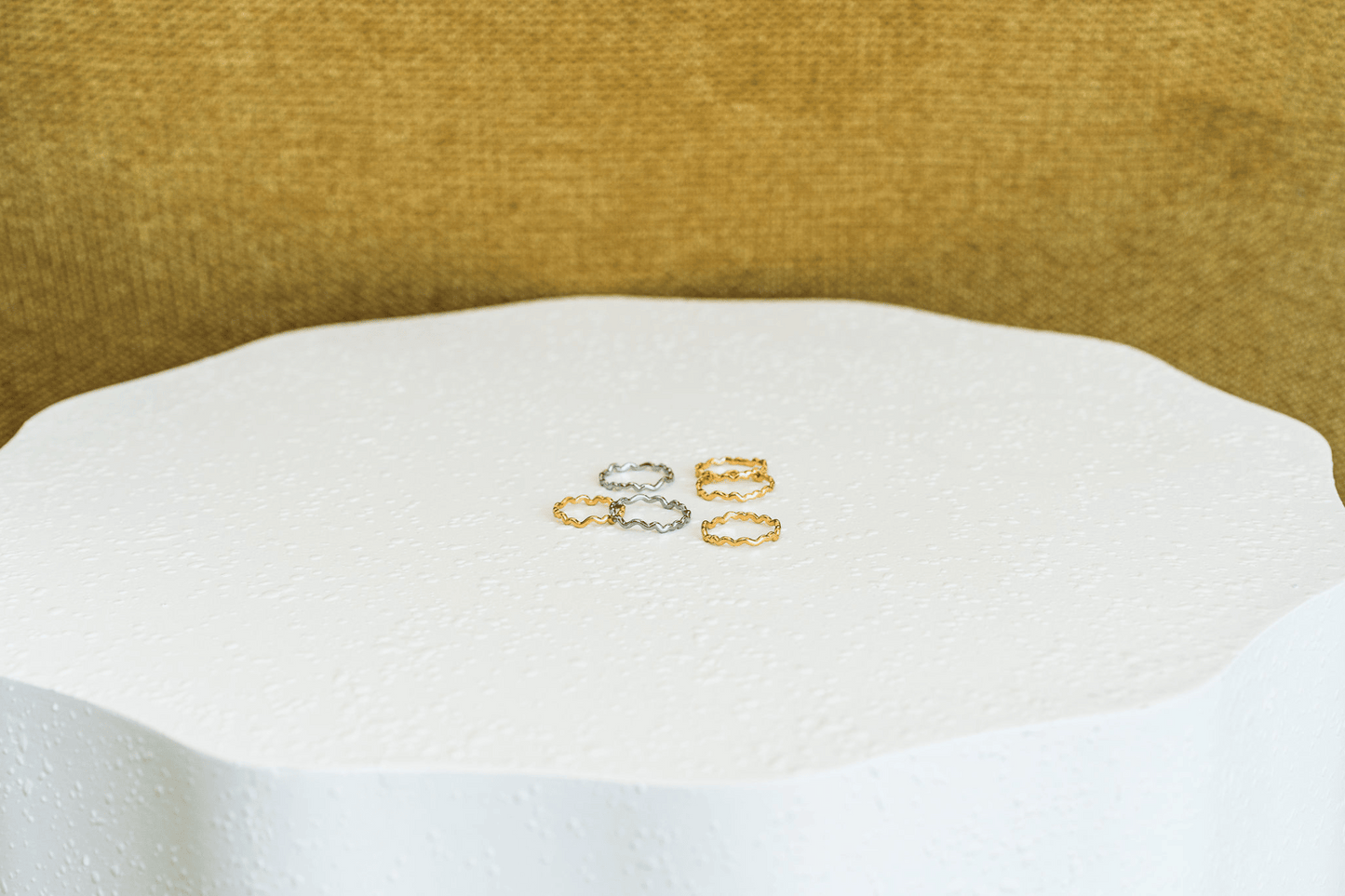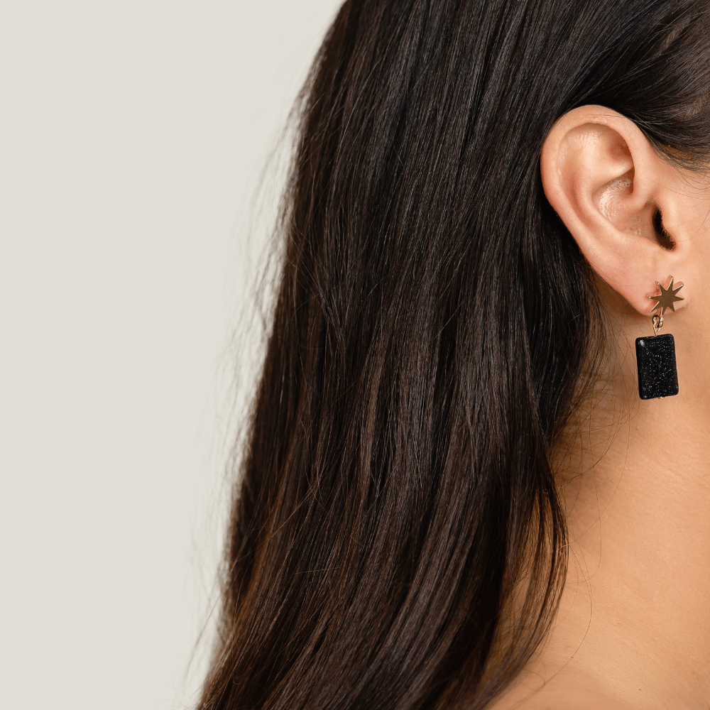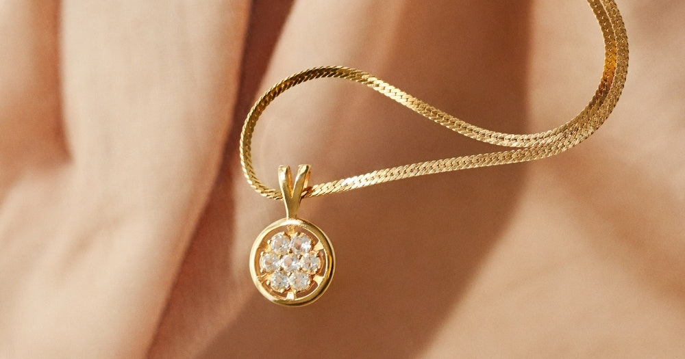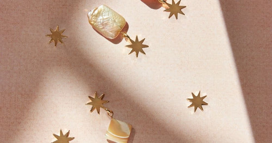 Woman wearing gold jewelry and close-up of gold jewelry on a teal surface.