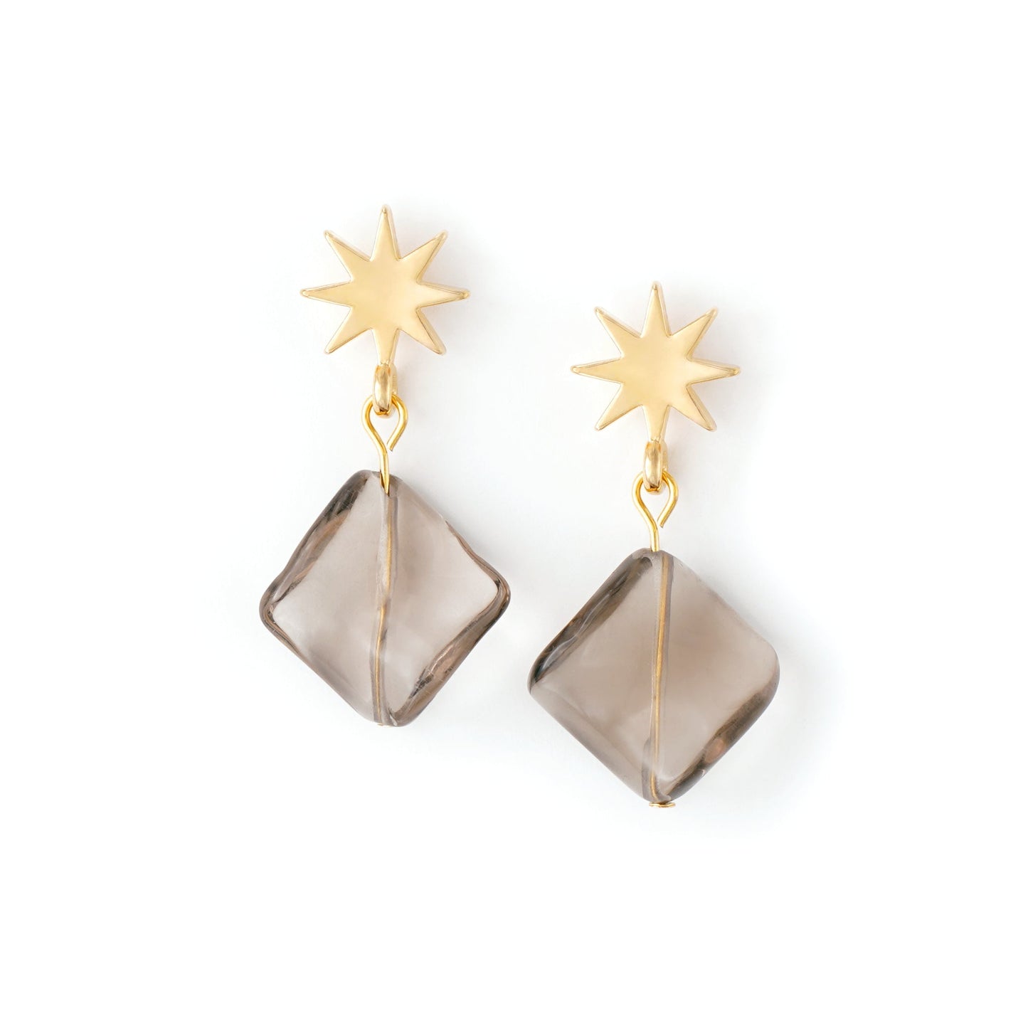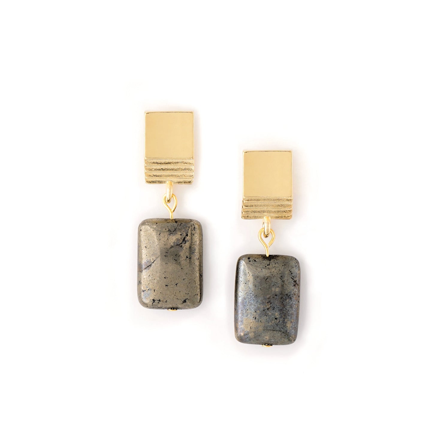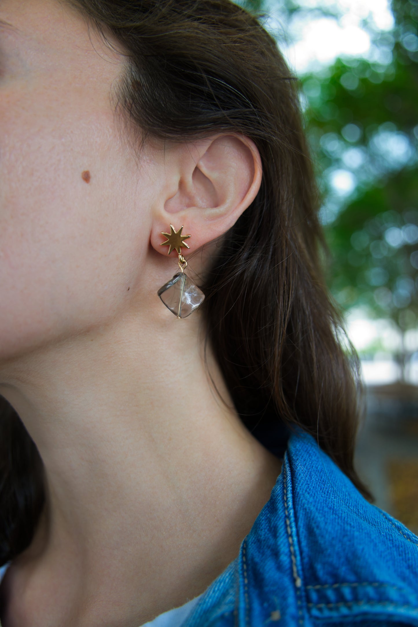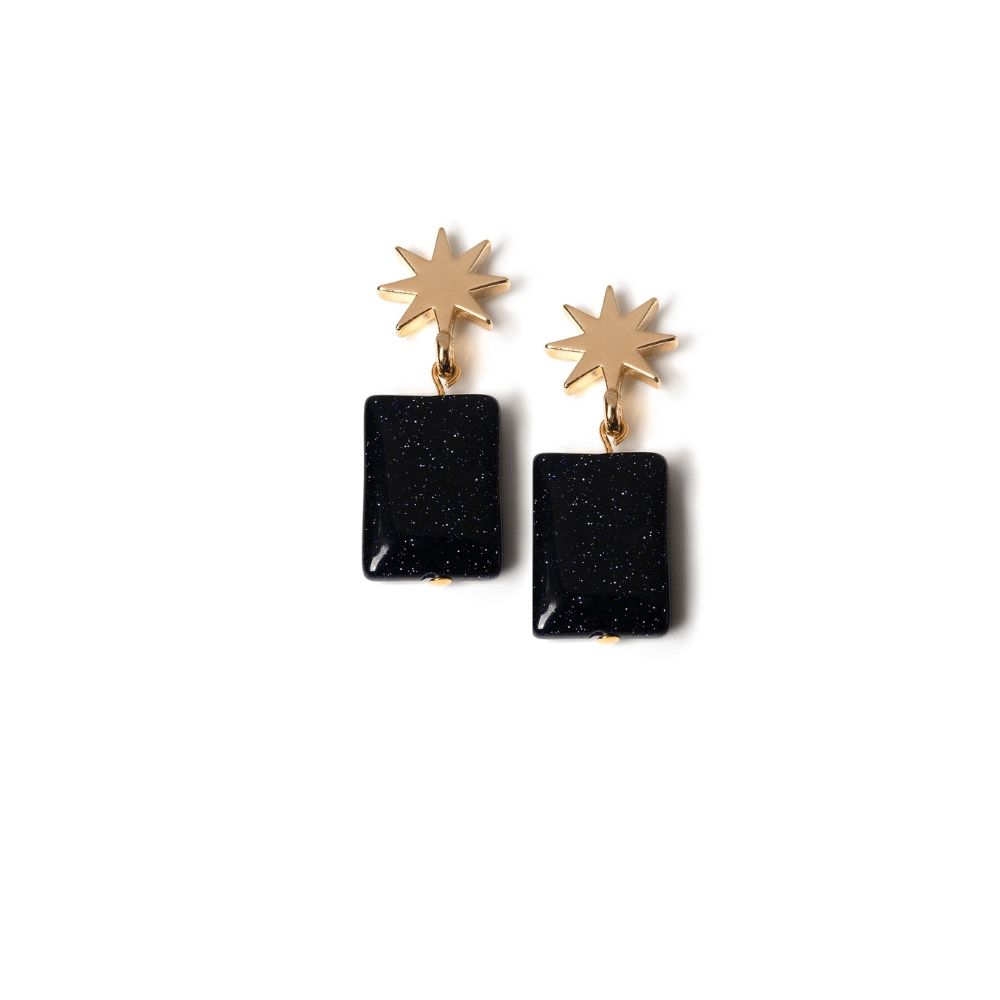 Woman wearing gold jewelry and close-up of gold jewelry on a teal surface.