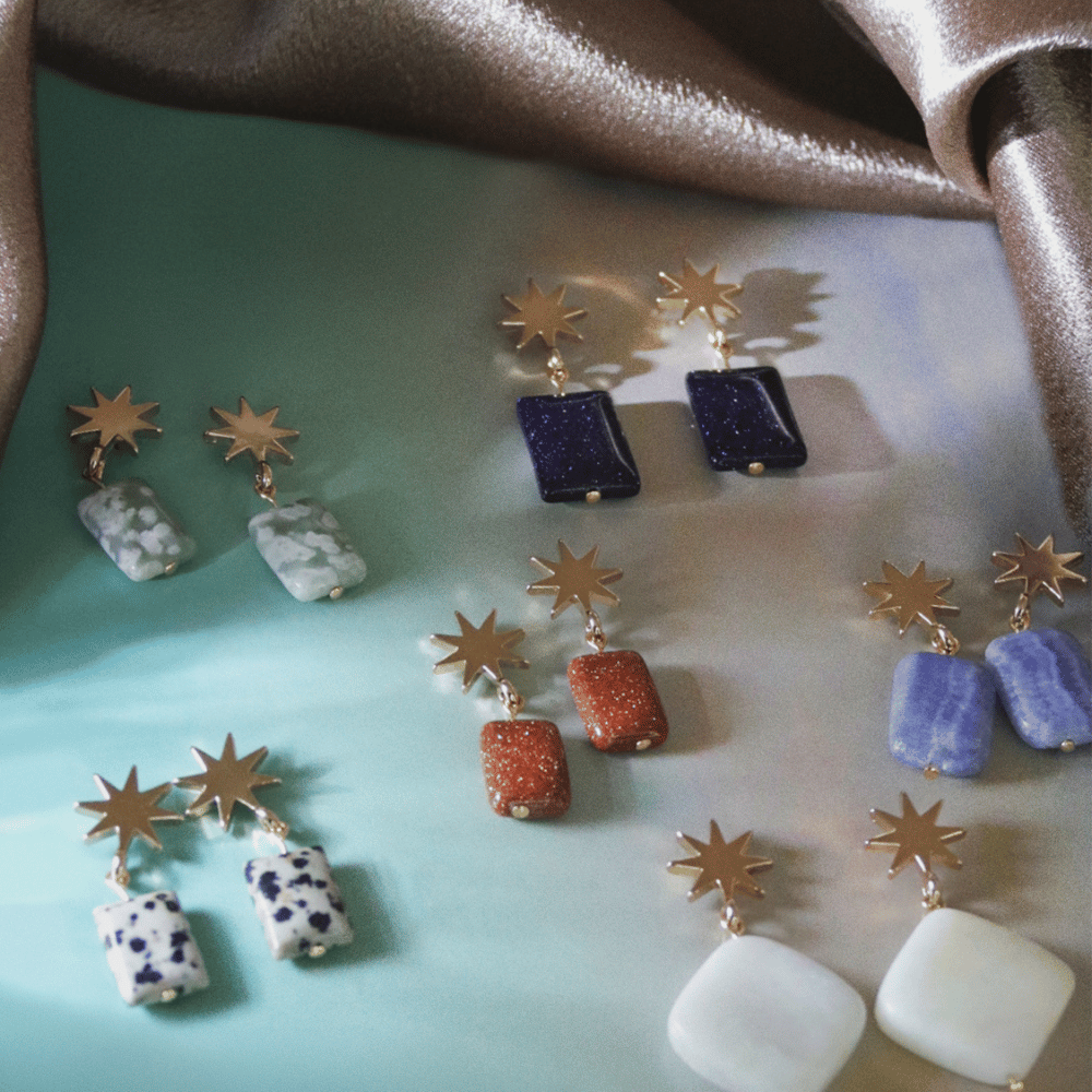 Sculptural shine meets deep midnight sparkle. Rectangular navy goldstone catches the light with quiet shimmer, anchored by our signature eight-point gold stars. The contrast of form and texture makes these drops feel both refined and a little unexpected.