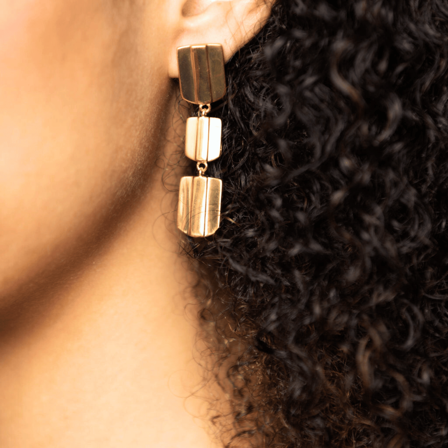 The Layered Dome Drop earrings feature not one, but three golden layered domes creating a striking drop earring pair that you'll love to wear again and again.